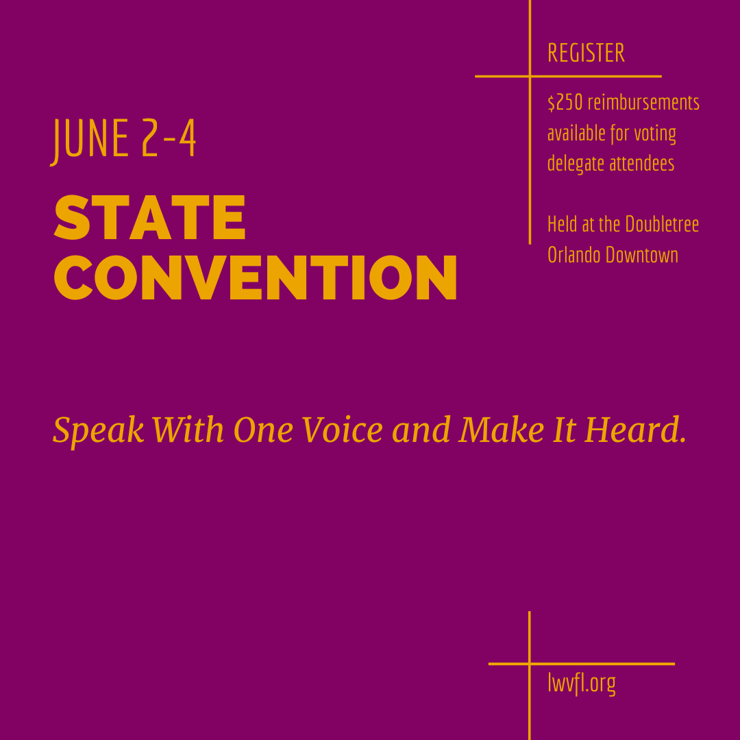 If you have already signed up for the convention and would like to be a delegate, please contact Deborah Coffy, Project Coordinator of LWVOC, to register as a convention voting delegate before May 31st!