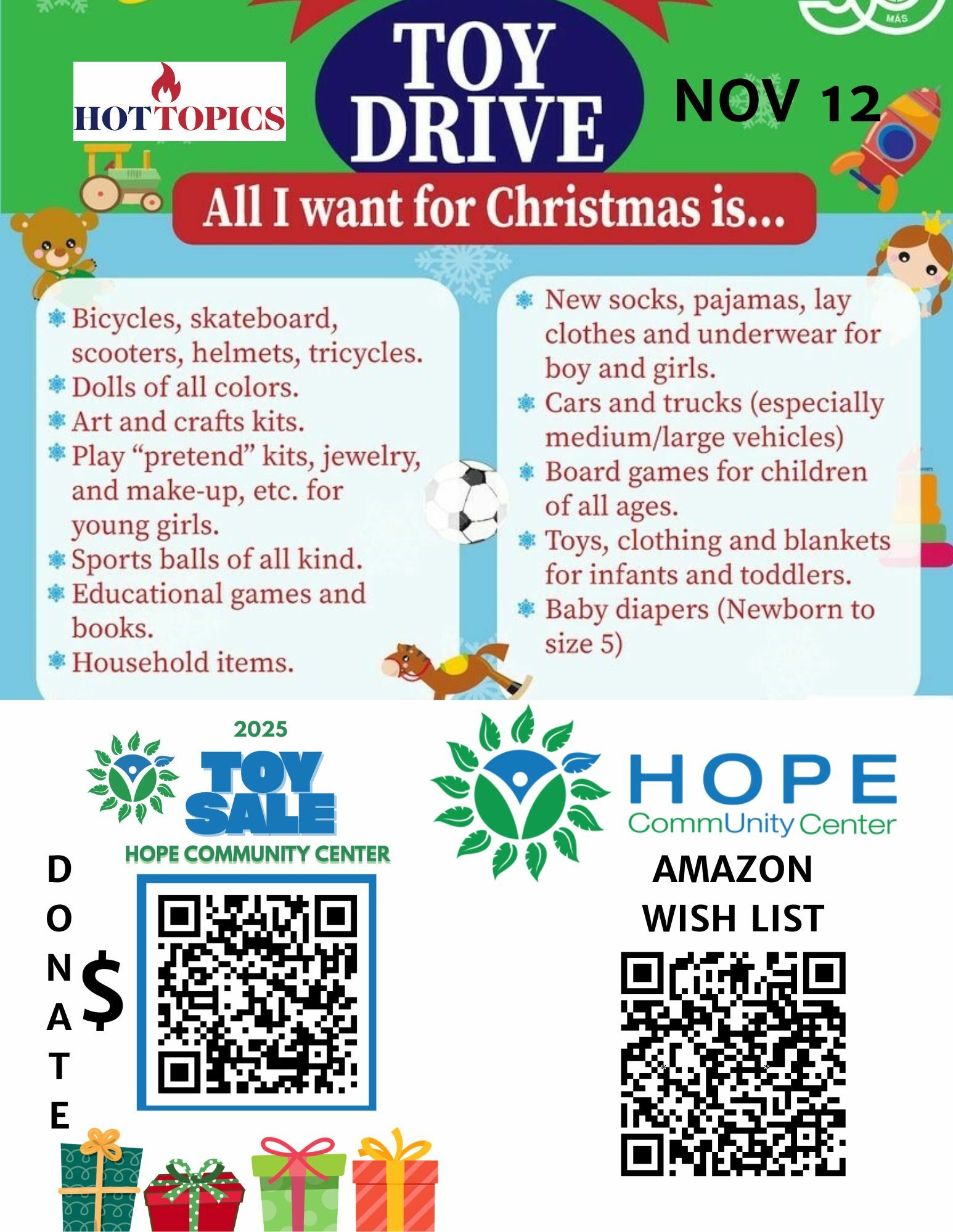 This season of thanks and giving, please consider bringing a child’s toy and a food item to Hot Topics.