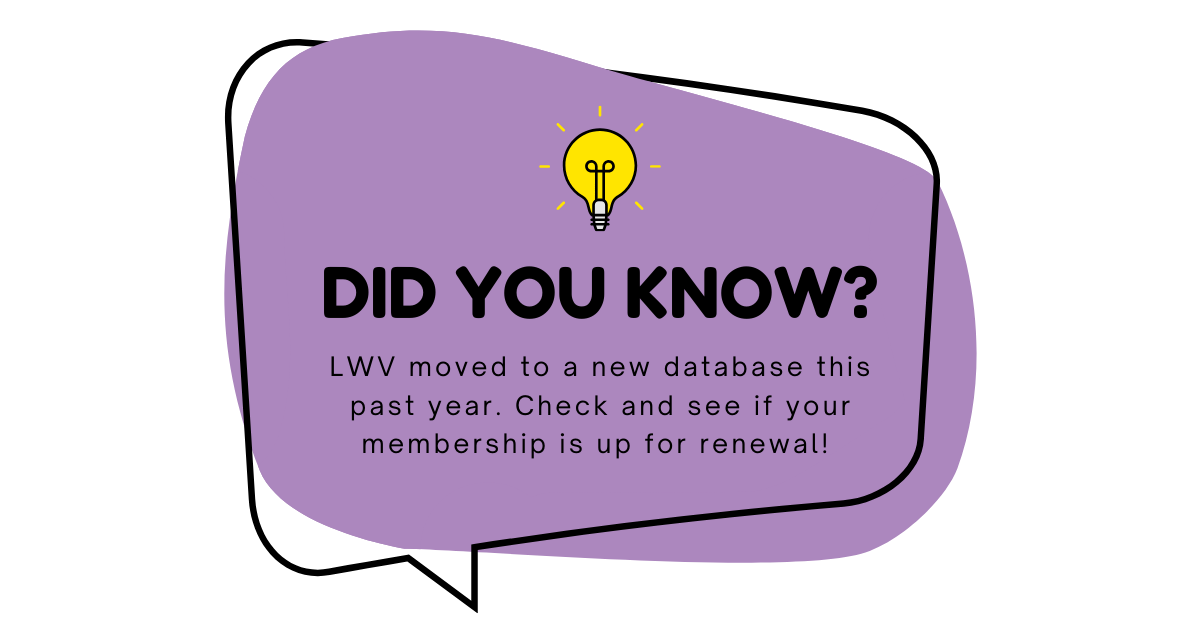 *Current members, don't forget that you'll be renewing through our national LWVUS site! Watch your email for reminders! |  | Susan Spradley