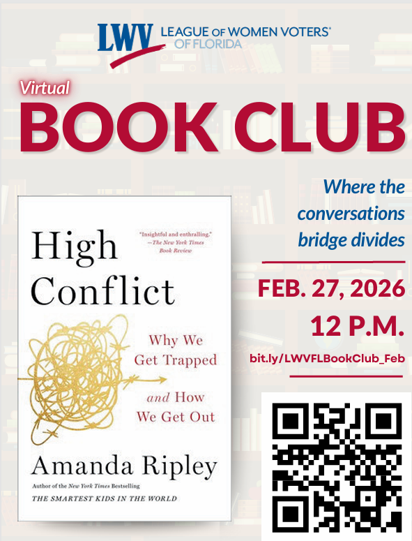 | | | NEEDED: Voter Outreach volunteers who speak Spanish or Haitian Creole!! Please contact>> Saudi Ellis |  | | @LWVFlorida is launching its virtual book club on Feb. 27, 2026 as part of our statewide initiative to build trust within our communities and strengthen Floridians’ ability to engage in civil dialogue. We’re excited to connect with our neighbors and discuss High Conflict by Amanda Ripley. You don’t want to miss this book club! RSVP at bit.ly/LWVFLBookClub_Feb.